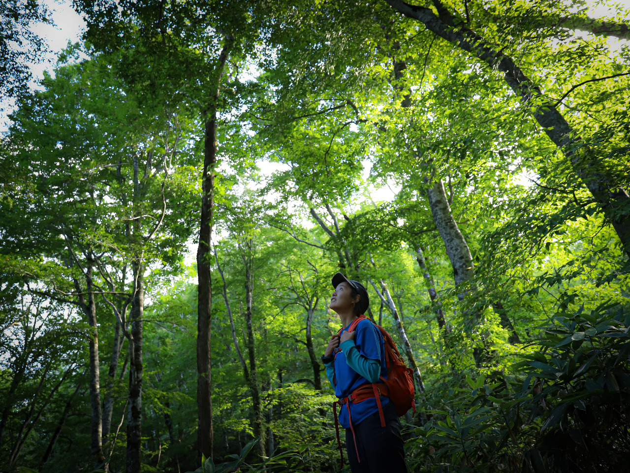 緑のステンドグラスの下を歩いているような春のブナ林をお楽しみいただけます。