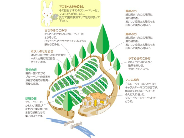 山の緑に囲まれた広々とした園内で、さわやかな高原の風に吹かれながら、ブルーベリーの美味しさを堪能して下さい。
