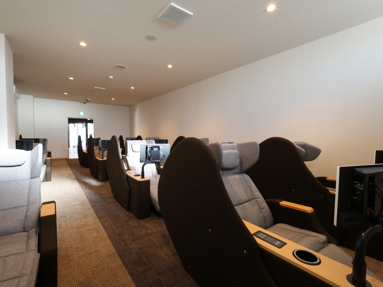 リクライニングチェアには、19型テレビとシート内蔵スピーカー付き。コンセントやUSB充電、Cタイプ充電機能も完備!