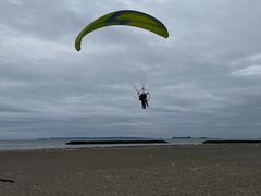 モーター付きパラグライダーなので、山に登らなくても安全な砂浜からふんわり飛び立ちます