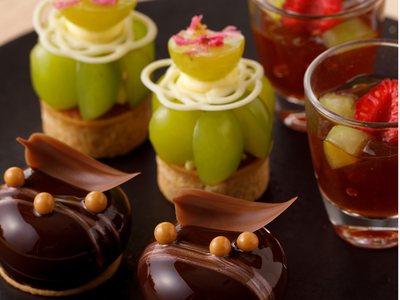 シャインマスカットを使用したバーテンダー考案のウェルカムドリンクで始まり、スパイスやハーブ、紅茶をアクセントにしたメニューが香りと旨味を引き立てます。シェフのおすすめは、シャインマスカットの果汁をたっぷり使った自家製のソルベ。アクセントにピンクペッパーを合わせたフランス産のフロマージュブランを使った軽い食感のチーズケーキと一緒にお召し上がりください。