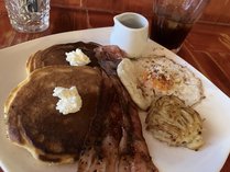 名物「ランバージャック」は、パンケーキ・ベーコン・目玉焼きが揃った満足プレートを