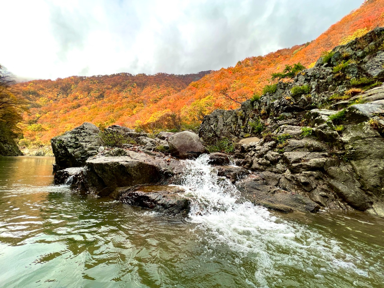 磐梯朝日国立公園の中でも景勝地として見事な景観が広がる「赤芝峡」。一帯はヤマモミジやカエデ、ブナなどの広葉樹に覆われ、毎年秋には真っ赤に色づく紅葉の名所です。「日本の赤壁」などと呼ばれたことから赤芝峡という名前がついたとも言われています。