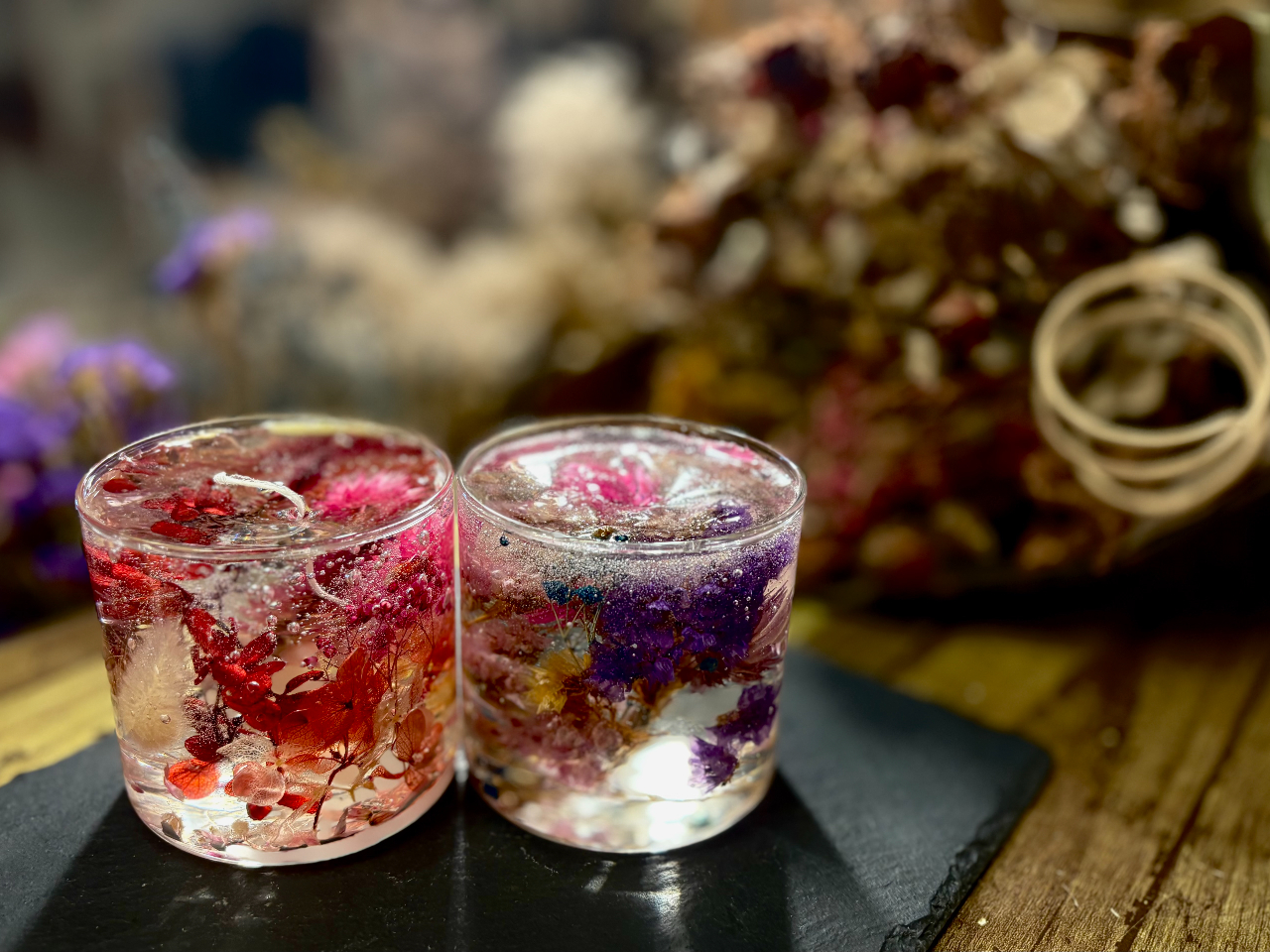透明なキャンドルグラスに上質なドライフラワーとジェルワックスを流し込んで、ナチュラルでボタニカルなキャンドルをお作りいただけます。キャンドル作り(アロマキャンドル等)