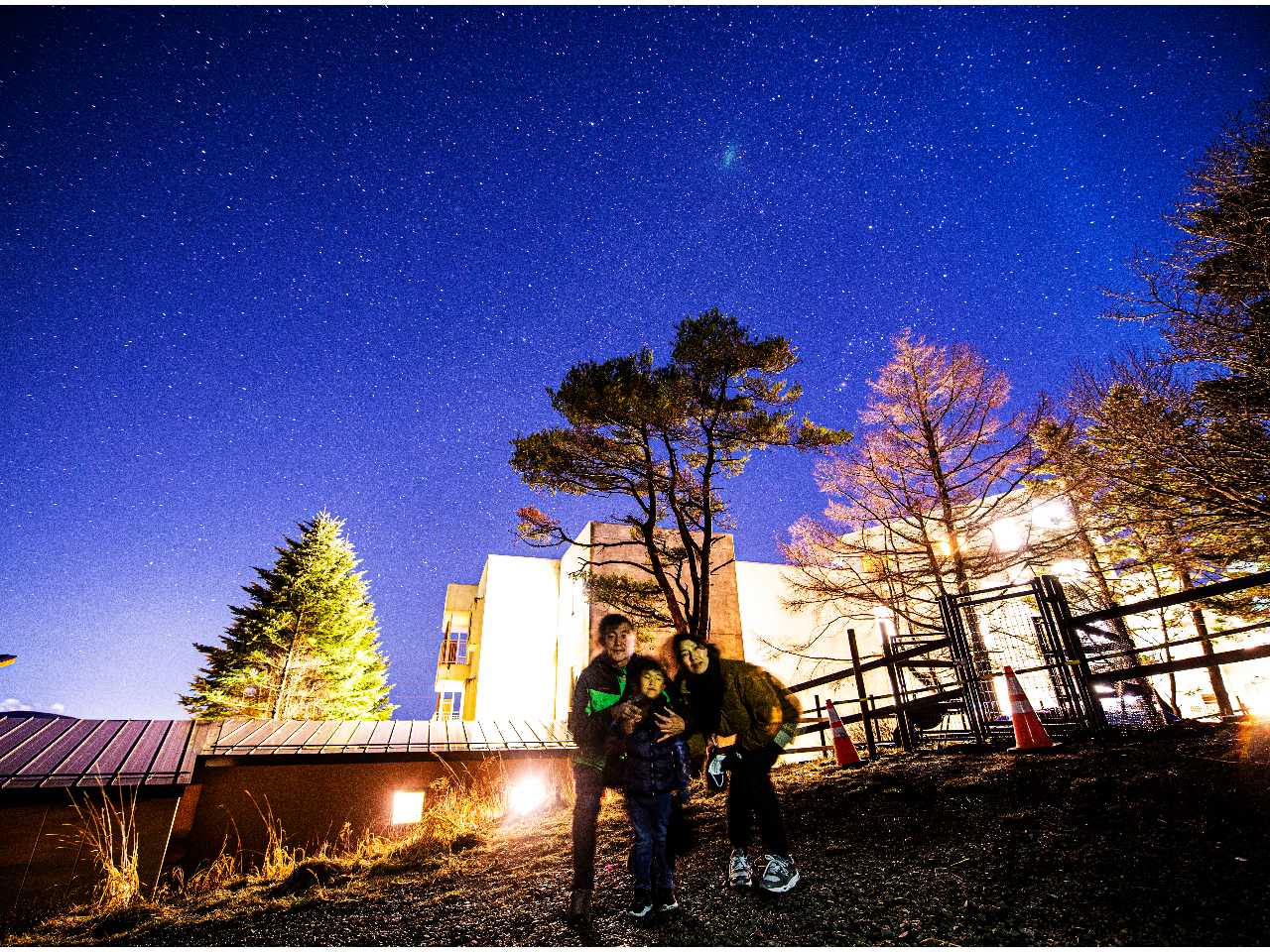 星空観察ツアーに参加しました。当初の予約枠はもういっぱいだったということで違う時間になりましたが、ご対応いただいてありがたかったです。ガイドさんの楽しいお話とともに、普段なかなか見ることができない満天の星空を眺めることができました。夏の大三角形や北極星の見つけ方など、昔習った私には懐かしく、まだ習っていない子供には新たな知識として興味深いものでした。また、樹海洞窟探検のツアーにも参加しました。どちらもとても楽しかったです。