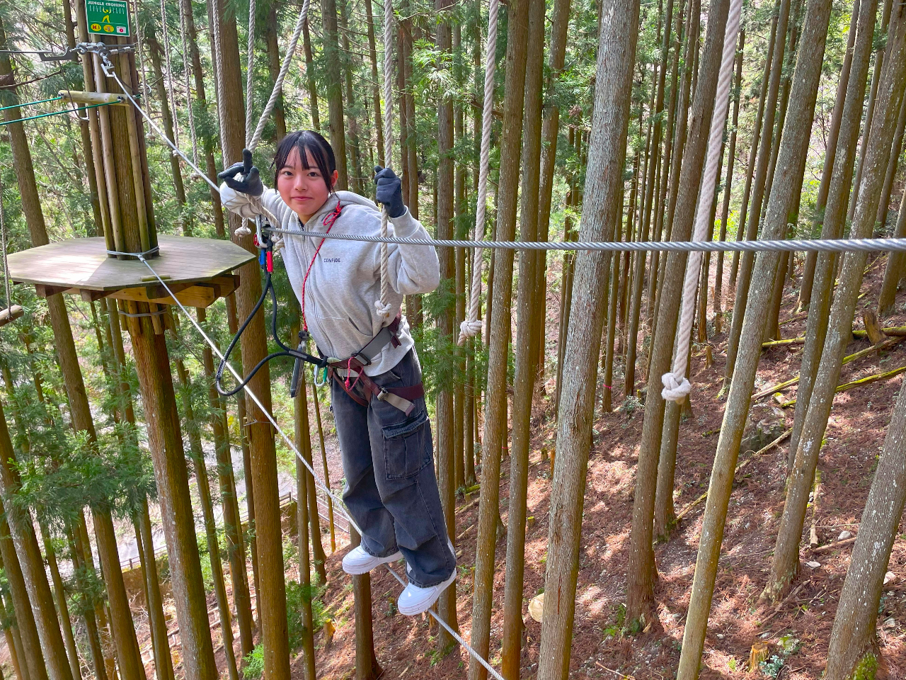 不安定なアスレチックを渡っていきます。ハーネスをつけているから安心して渡れます。
