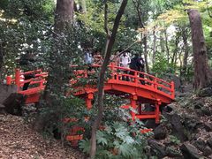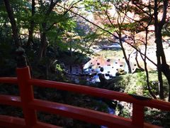 紅葉の時期、秋晴れの日に小石川後楽園を訪れました。園内に入り、渡月橋を渡り、階段を上がりきると、通天橋が見えてきます。通天橋の上からも紅葉の素晴らしい風景が見れますが、紅葉の木々に囲まれた朱色の橋の姿を上から見るのも美しいです。