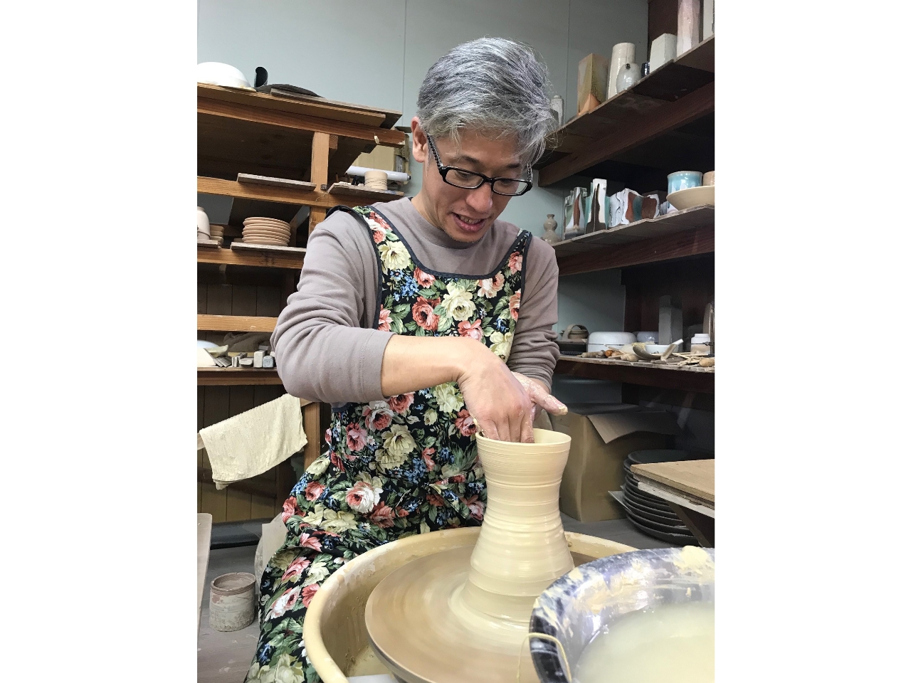 電動ろくろを使い作品を作ります。作業場は冷暖房完備で快適です。