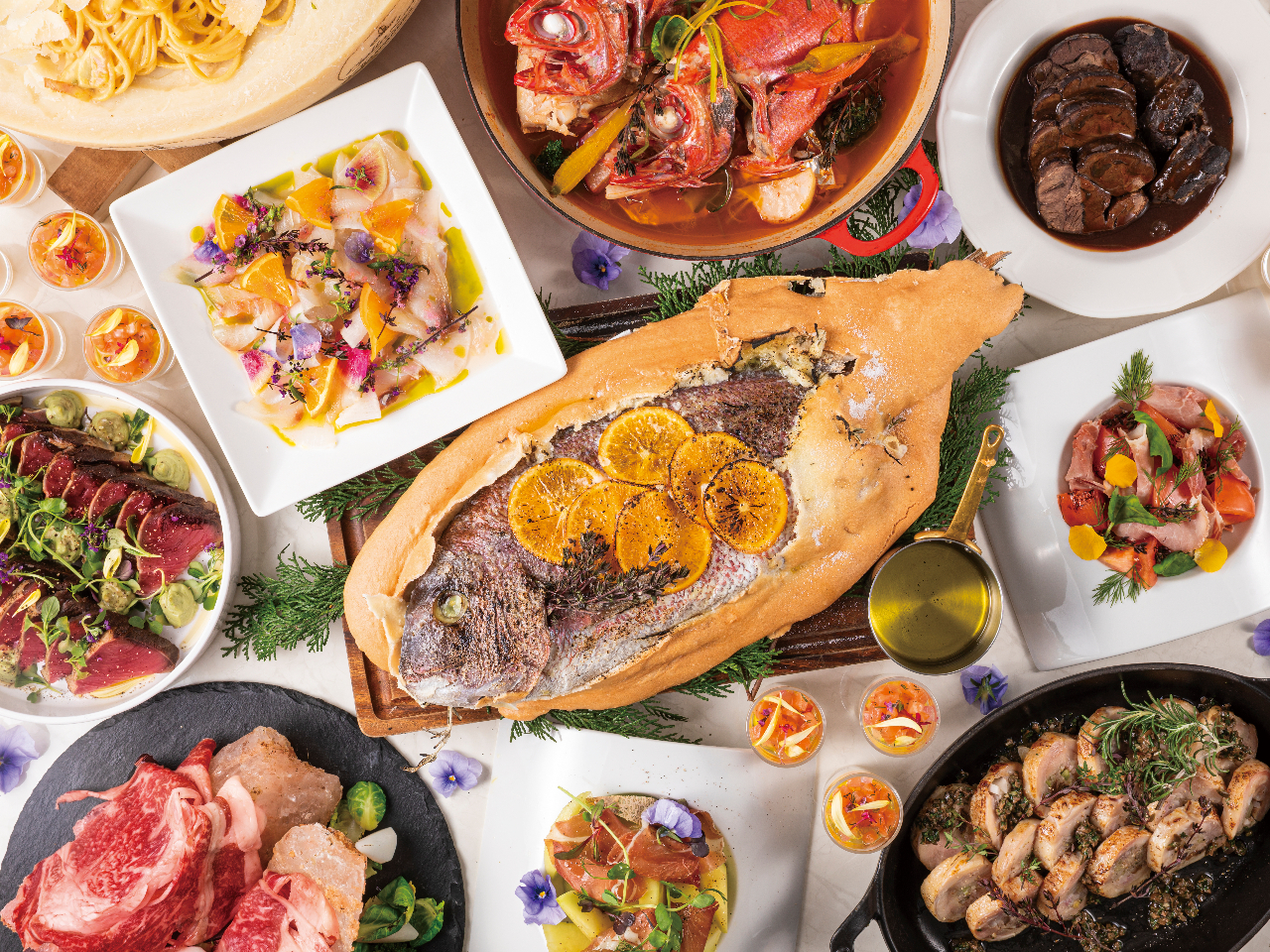 「ブラスリー ミリー ラ・フォーレ」がお届けするセレブレーションランチブッフェ。三浦佐島漁港から仕入れた魚のブイヤベースや、国産牛と三浦産の野菜を使用した岩塩炙り焼きなど、目にも美しい料理の数々が揃う