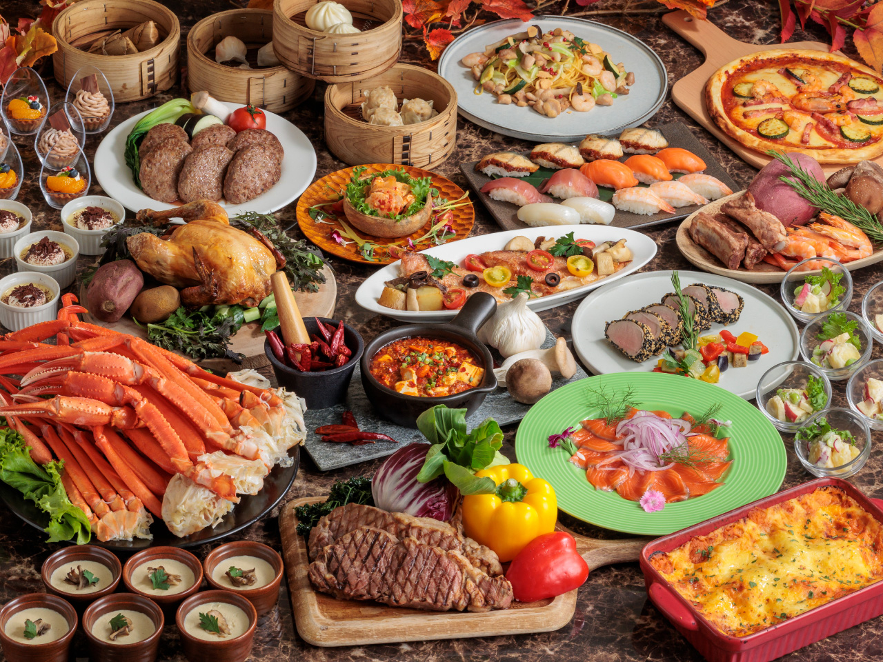 ▼蟹、寿司、牛ステーキ…と豪華メニューを食べ放題で