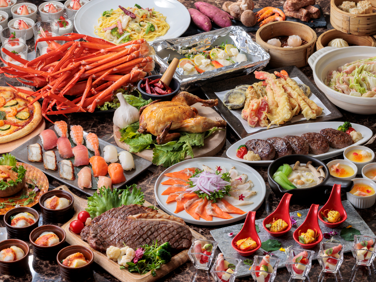 ▼蟹、寿司、牛ステーキ…と豪華メニューを食べ放題で