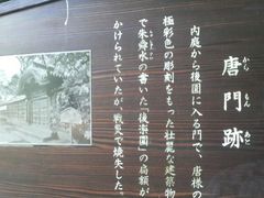 紅葉の小石川後楽園訪ねました。内庭といわれる、書院の建っていた周辺は、改良工事が行われていて、中に入ることはできませんでした。その入り口付近に、唐門跡があります。戦災で焼けてしまったそうで、今は、土台のみです。