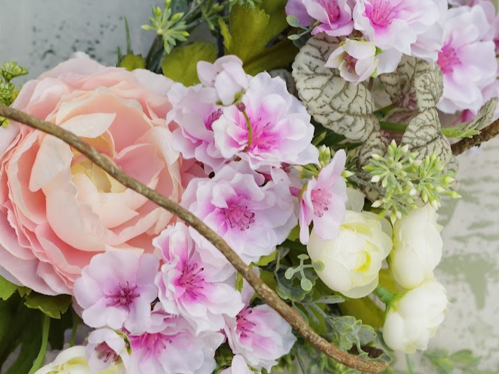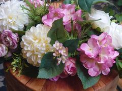 紫陽花とローズのガーデンアレンジを作りました。写真通り、紫陽花のアーティシャルフラワーは色も質感もとても綺麗です。造花のイメージが変わりました。