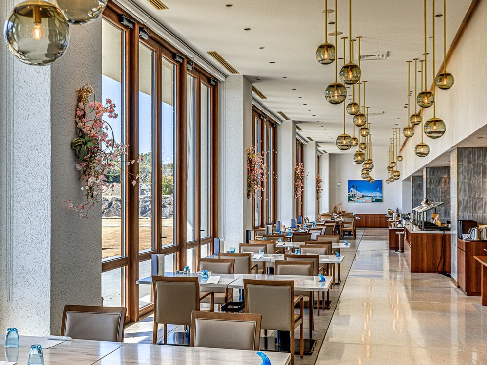 窓の外に広がる海とガーデンを眺めながら、優雅なランチタイムをお楽しみください。