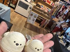 店主愛用の地元のおすすめ商品や、シマエナガグッズ、大漁旗をリメイクしたグッズも販売しています。