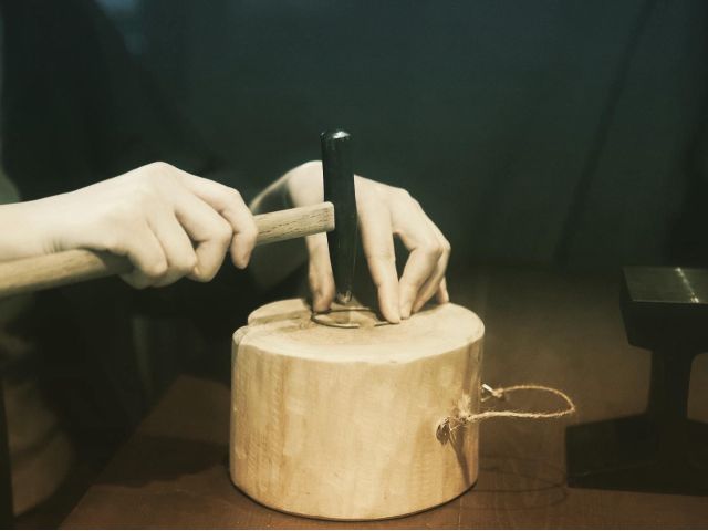 シルバー950地金を金槌で叩いて模様をつけるバングル制作を体験していただきます。