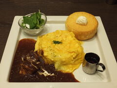 ビーフシチューオムライスとパンケーキのプレートと星乃ブレンド。
