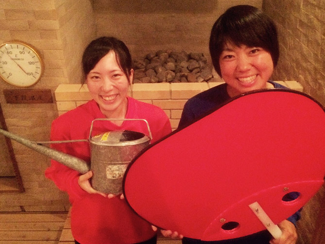 サウナでは、熱く焼いた石に水を掛ける事で大量の水蒸気を発生させ、体に負担を掛けずに急激な発汗を促すサービス「ロウリュウ」