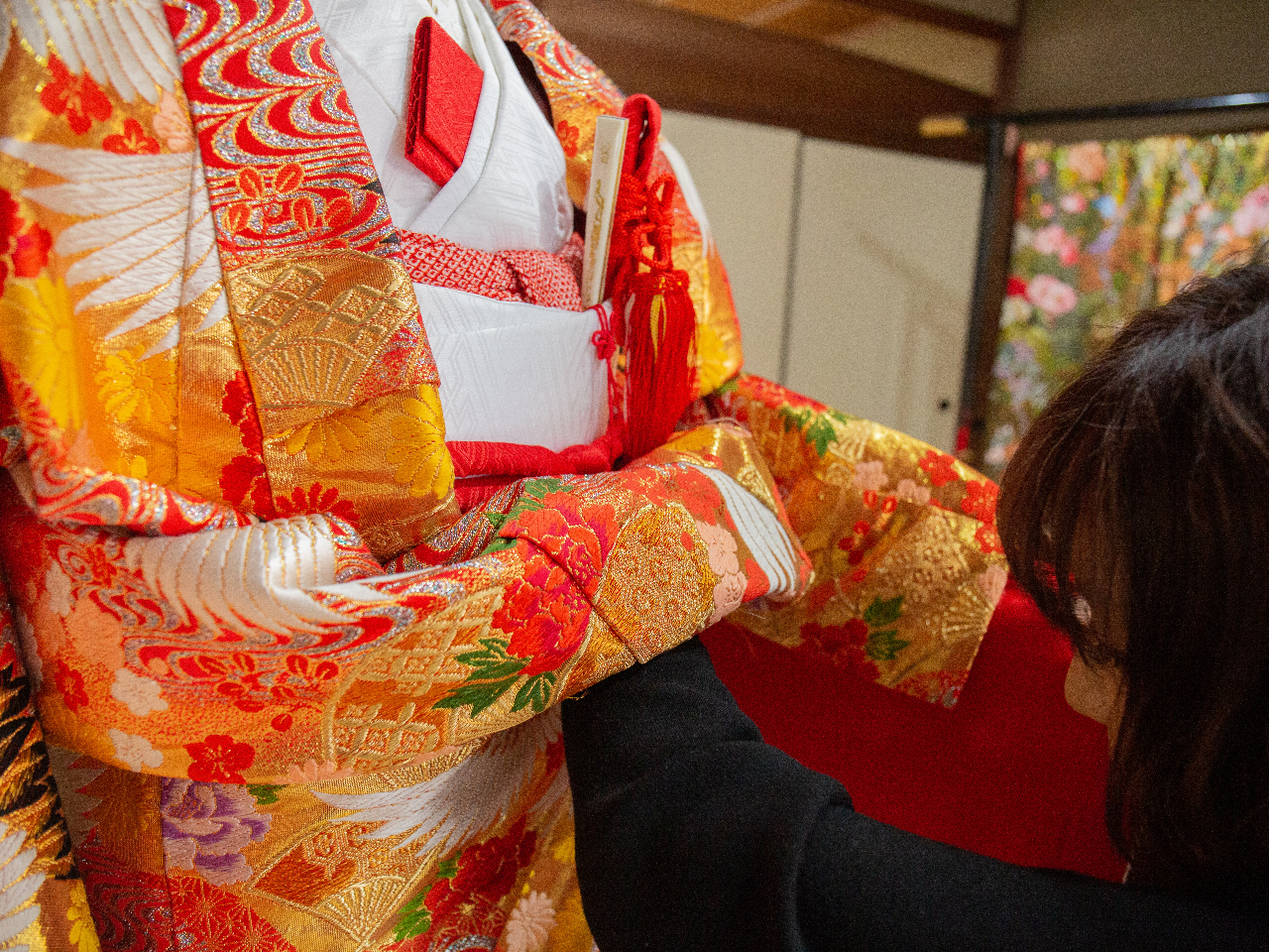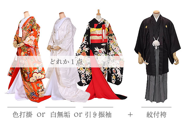 女性は白無垢、色打掛、引振袖の中からお好きな色の着物を1着、男性は紋付袴をお選びいただけます。