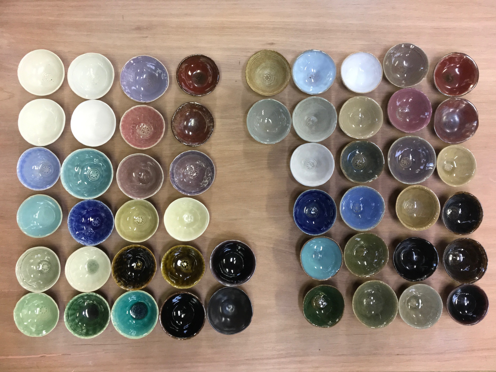 色見本。2種類の土(左が白土、右が赤土)と多種の釉薬の組み合わせで、様々な色から選べます。