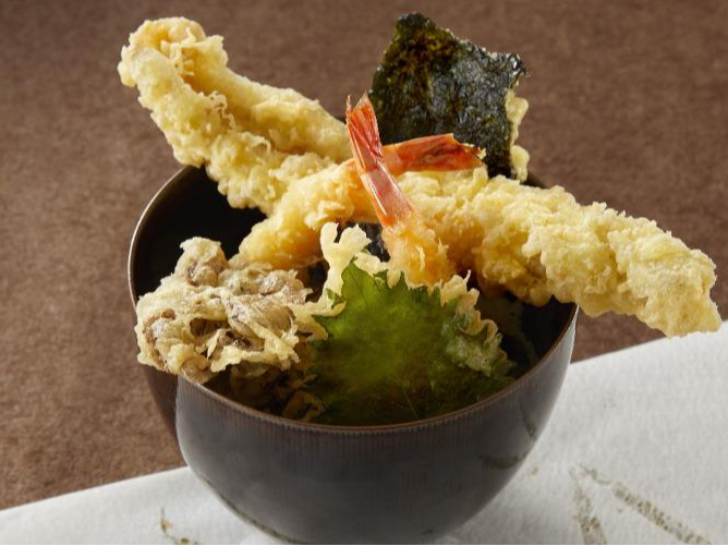 丸ごと一本の穴子と海老、添え野菜を天ぷらに仕立て、