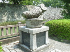 駿府城公園のお濠端に奇妙な石碑を発見しました。一見芋虫の様ですが、どうも違います。近づいて見ると「わさび漬け発祥の地」と刻されています。あーここは静岡、なるほどと納得。