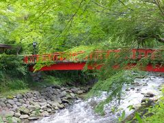 独鈷の湯から竹林の小径に向かう際に渡る橋で、今は緑の楓越しに朱色の橋が映えて綺麗ですが、紅葉の時期は更に美しい眺めです。