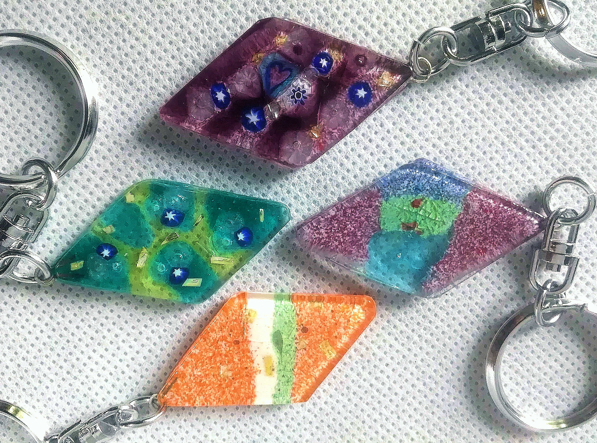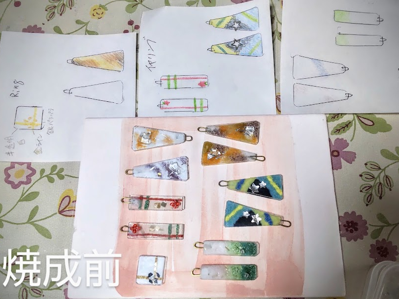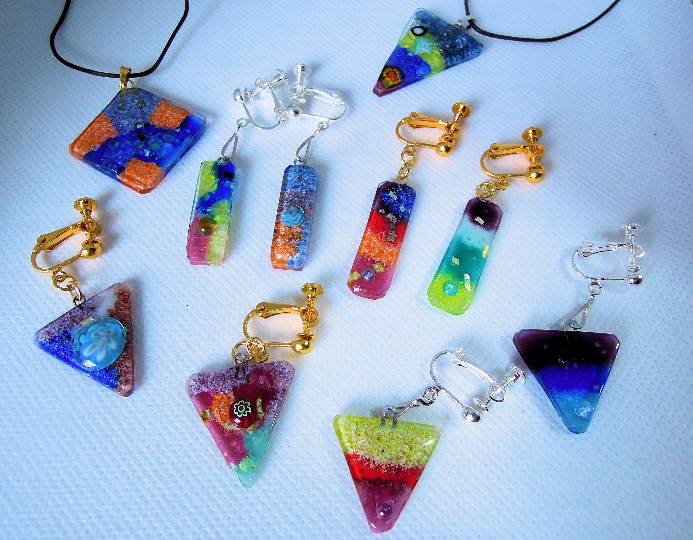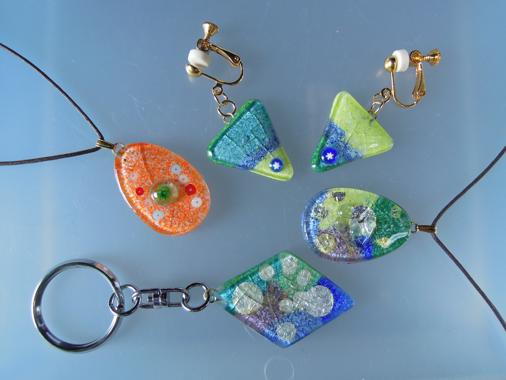 雫ペンダントとイヤリング・キーホルダーがきれいに出来あがりました。釉薬カラーは基本20色+&!!透明・半透明 トッピングも多種 ♪
