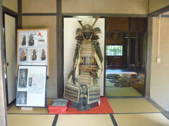 参道を思わせるような通りにある住宅です。立派な門構えの中に建つ二軒の家はかやぶき屋根になっていて、レトロ感がいっぱいです。家の中には甲冑が展示されていて、威厳を放っています。囲炉裏や調度品がそのまま残っているので、住人が今にも現れそうな感じがします。土間を通って行くと庭園が見えます。縁側に腰掛けて立派な庭園を眺めることもできます。大きな石灯籠が立ち、奥に竹林がある庭とよくマッチしています。心が落ち着く素晴らしい施設です。