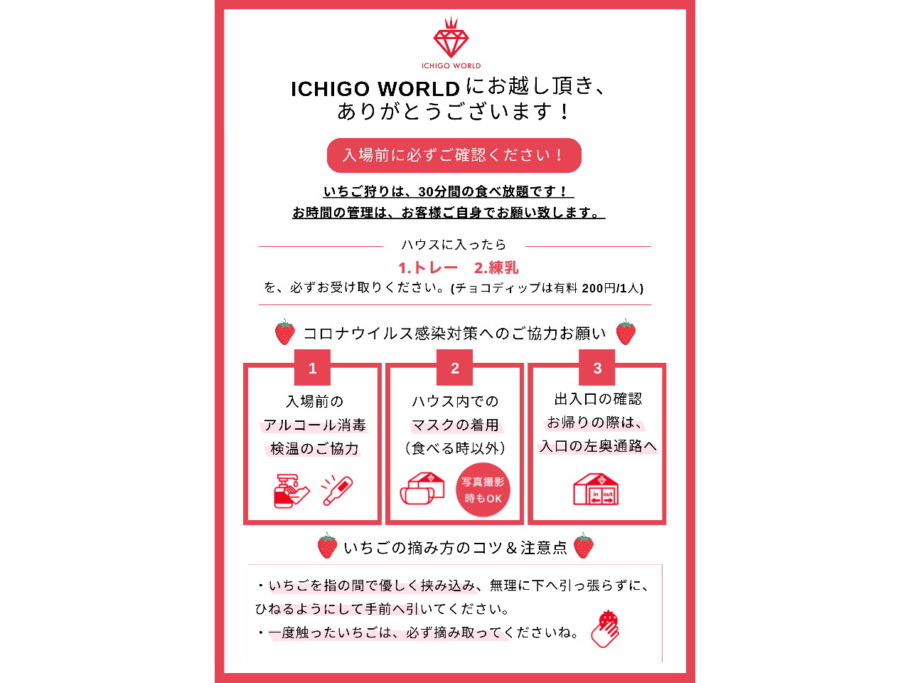 ※いちごやトッピングのチョコレートなどのお持ち帰りはできません。ハウス内でのみお召し上がりください。