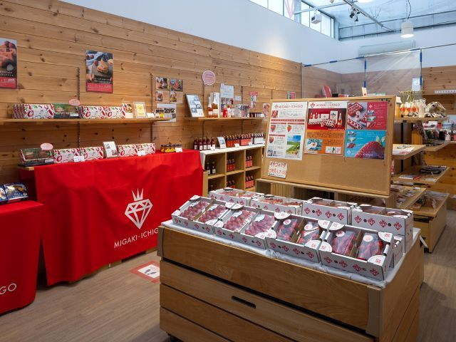 併設のショップでは、農場採れたてのミガキイチゴの直売の他、ここでしか手に入らない限定ミガキイチゴ商品やいちご関連商品を多数取り揃えています