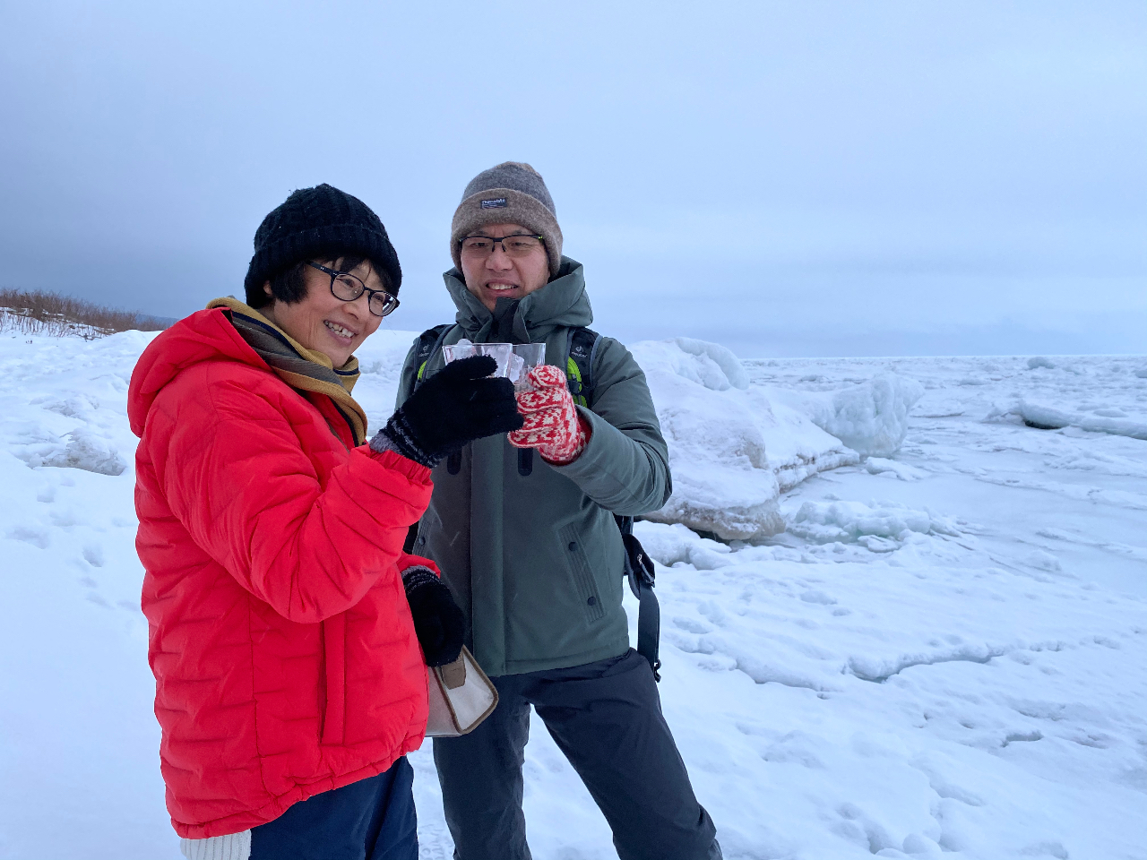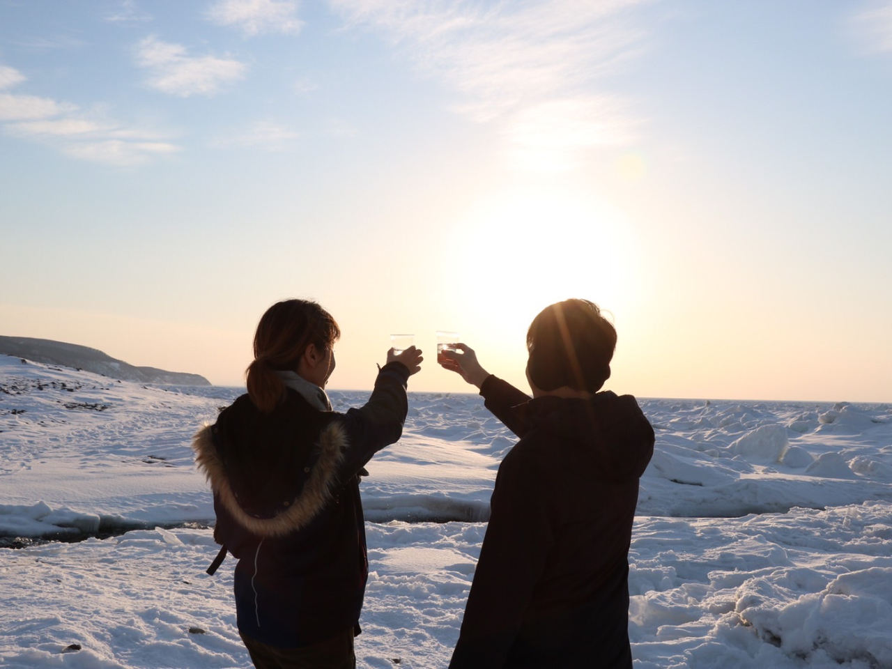 冬の知床にやってくる流氷、オジロワシやオオワシなどを眺めながら知床斜里/来運神社湧水の氷をグラスに入れてお好きなお飲み物で乾杯しましょう