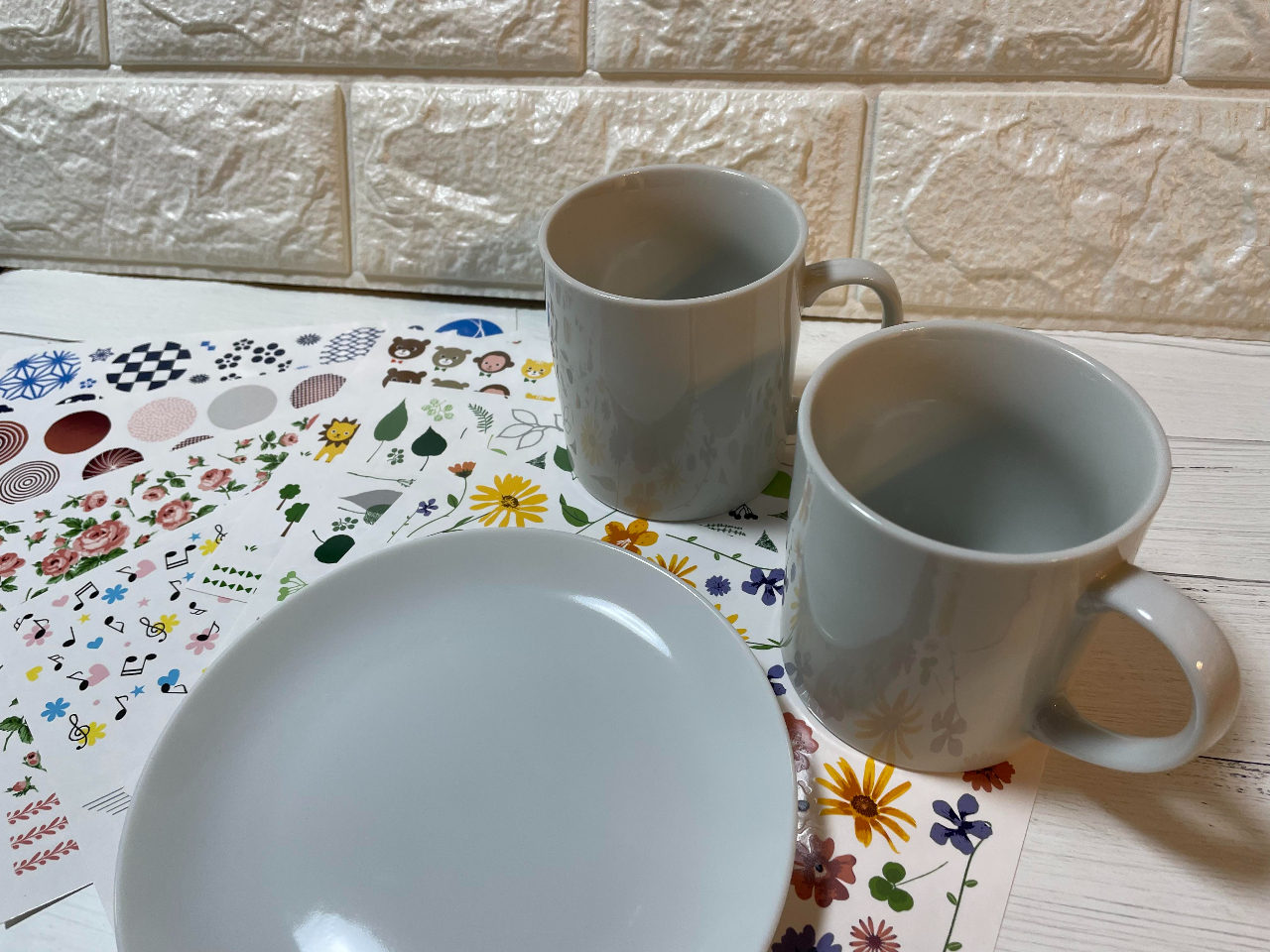 真っ白い器に、お好きなシール感覚の転写紙を貼って、世界に一つのオリジナル食器が創れます。