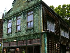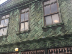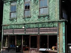 昭和初期に建てられた荒物屋で、外観は小さい銅板片を組み合わせて模様を作っていて、独特の造りで、面白いです。