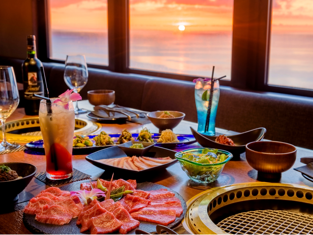 斜陽コースという名称だったけど、6時の一番目に訪れてみたが、すでに夕日は沈んだ後だった。見晴らしの良い席で5種の漬物等をいただきながら、オリオンの生ビールを1杯、美味し焼肉を焼きながら、もう1杯。締めのごはんもおいしく、妻との会話も弾み、大満足でした。ホテルのレストランのせいかワインリストを見たら、ちょっとお高めように思いました。今回はポイントとクーポンで大分助かりました。
