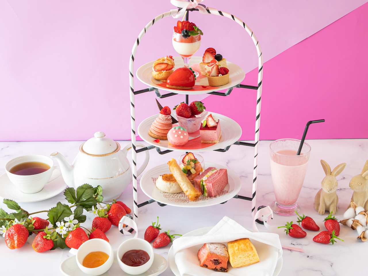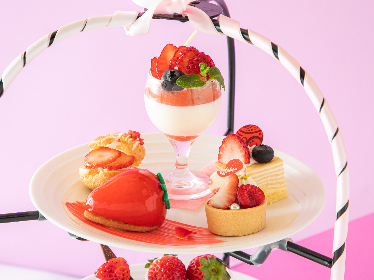 苺の魅力を詰め込んだ、心ときめくアフタヌーンティー。上質な空間で味わう、ホテルメイドならではの繊細で華やかなスイーツと、セイボリー。全17種類のドリンクとともに、優雅なひとときをお過ごしください。