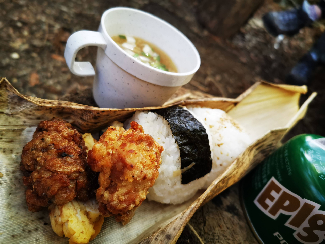 自然の中で食べるお弁当。シンプルなものが美味しいです。ガイドがご用意するみそ汁も適度に疲れた身体に沁みます…