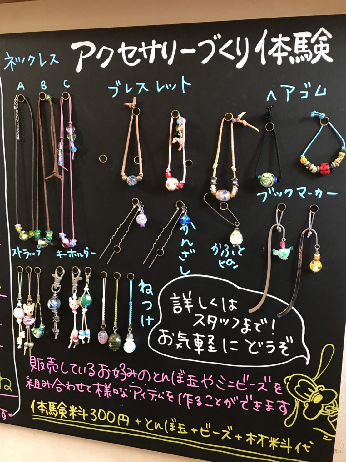 ※とんぼ玉体験をされた方で作ったとんぼ玉をアクセサリーにする場合、体験料はいただきません。
