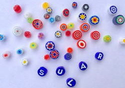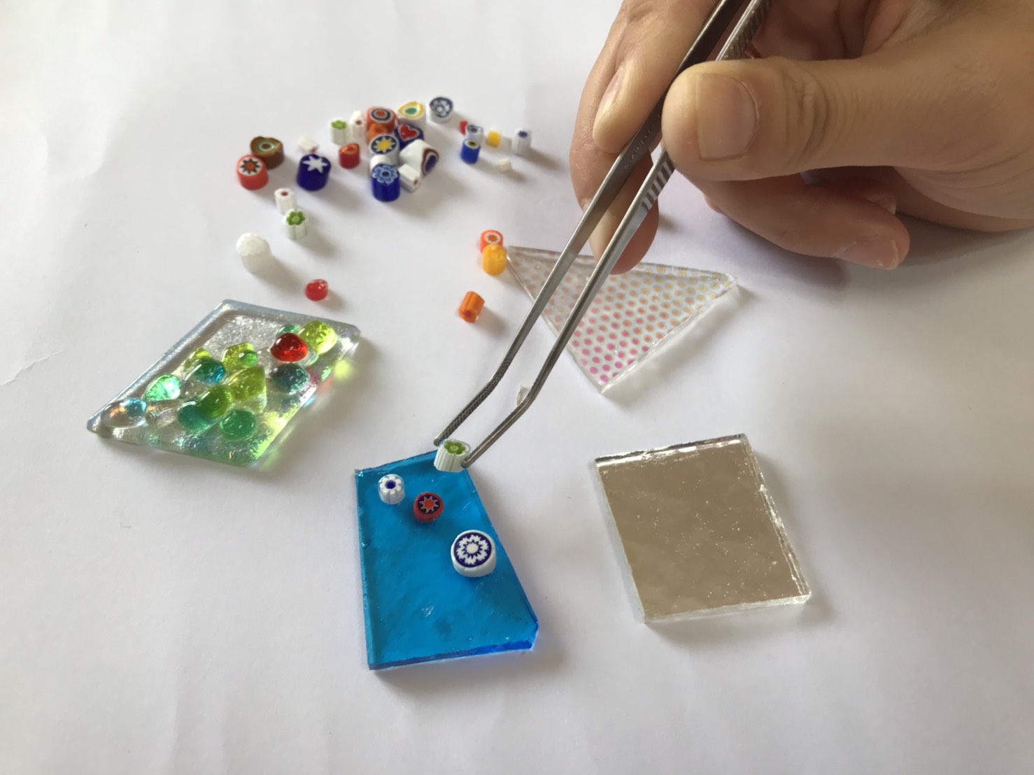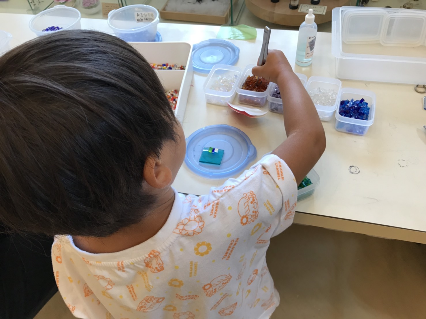 ガラスの板に、花やアルファベットなどのパーツを並べてオリジナルのトップを作る体験です。