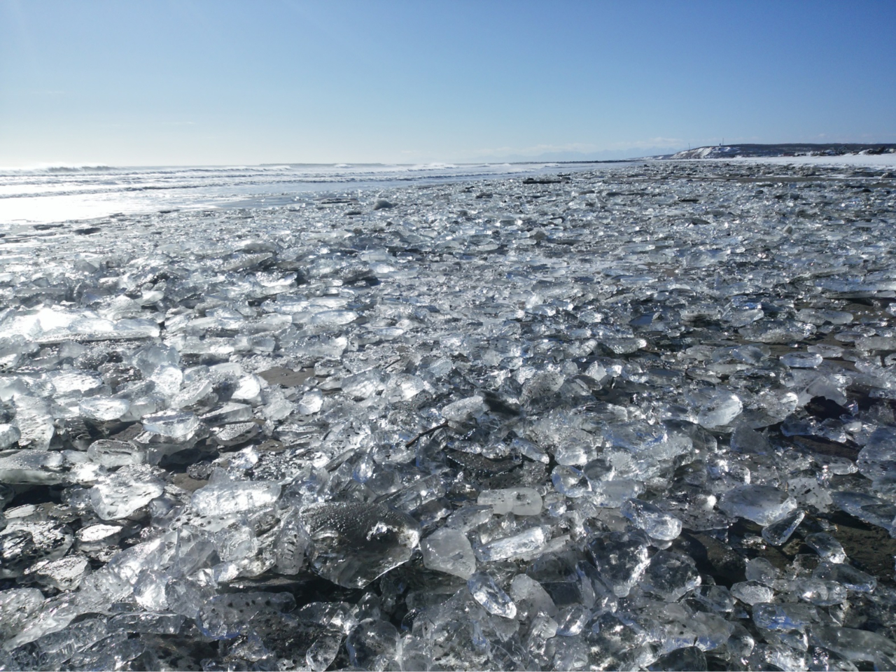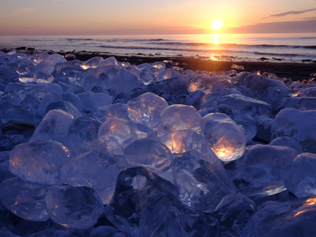 「ジュエリーアイス」は、十勝川を覆いつくす氷が太平洋に流れ出し、河口の豊頃町大津海岸に打ち上げられる氷の塊が太陽の光を受け美しく輝く自然現象です。