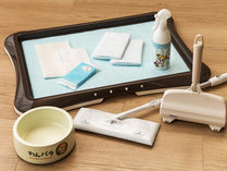 トイレトレー、トイレシーツ、うんち袋、粘着ローラー、消臭剤、わんちゃん用食器(1棟に2個)、折りたたみ式サークル(幅114cm×高さ58cm)etc...