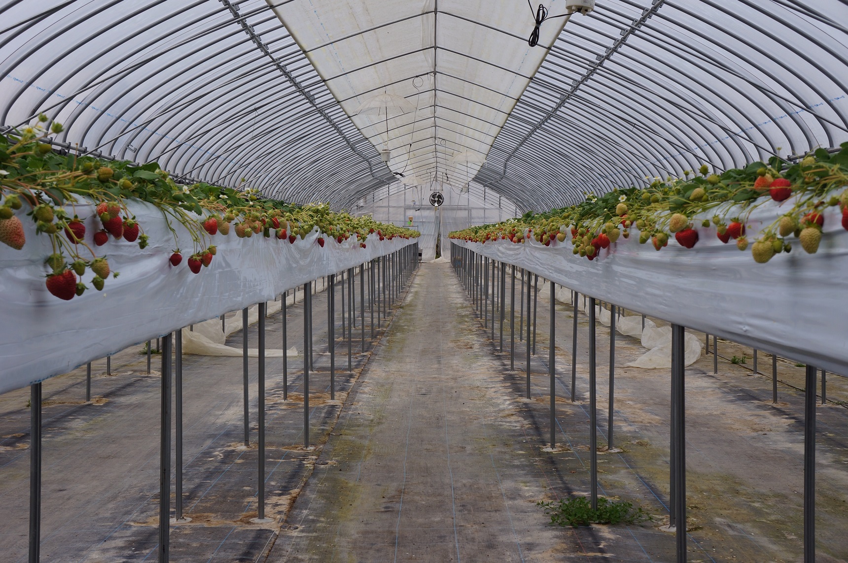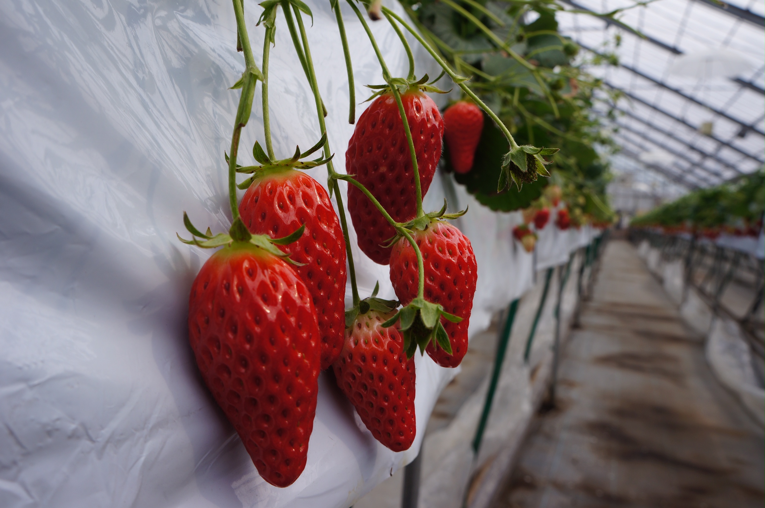 高設栽培のいちごハウスで、足元は汚れず、天気の心配もありません♪