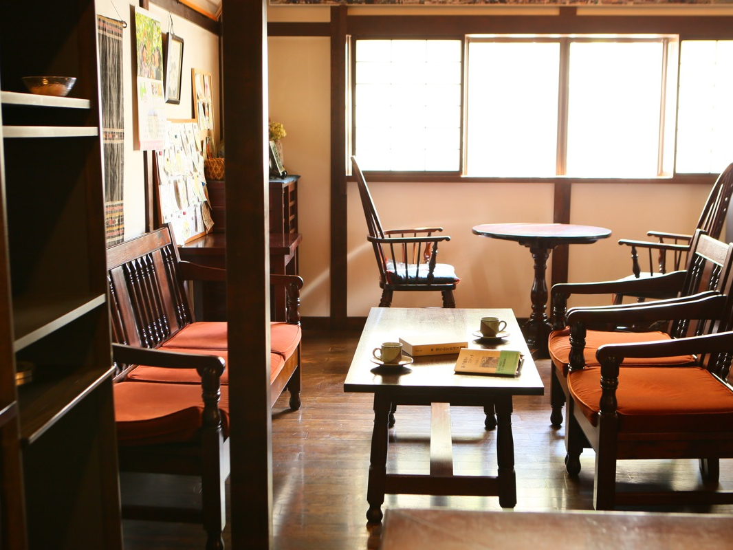 松本民芸家具の椅子やテーブルがならぶ談話室でちょっとひと休み。