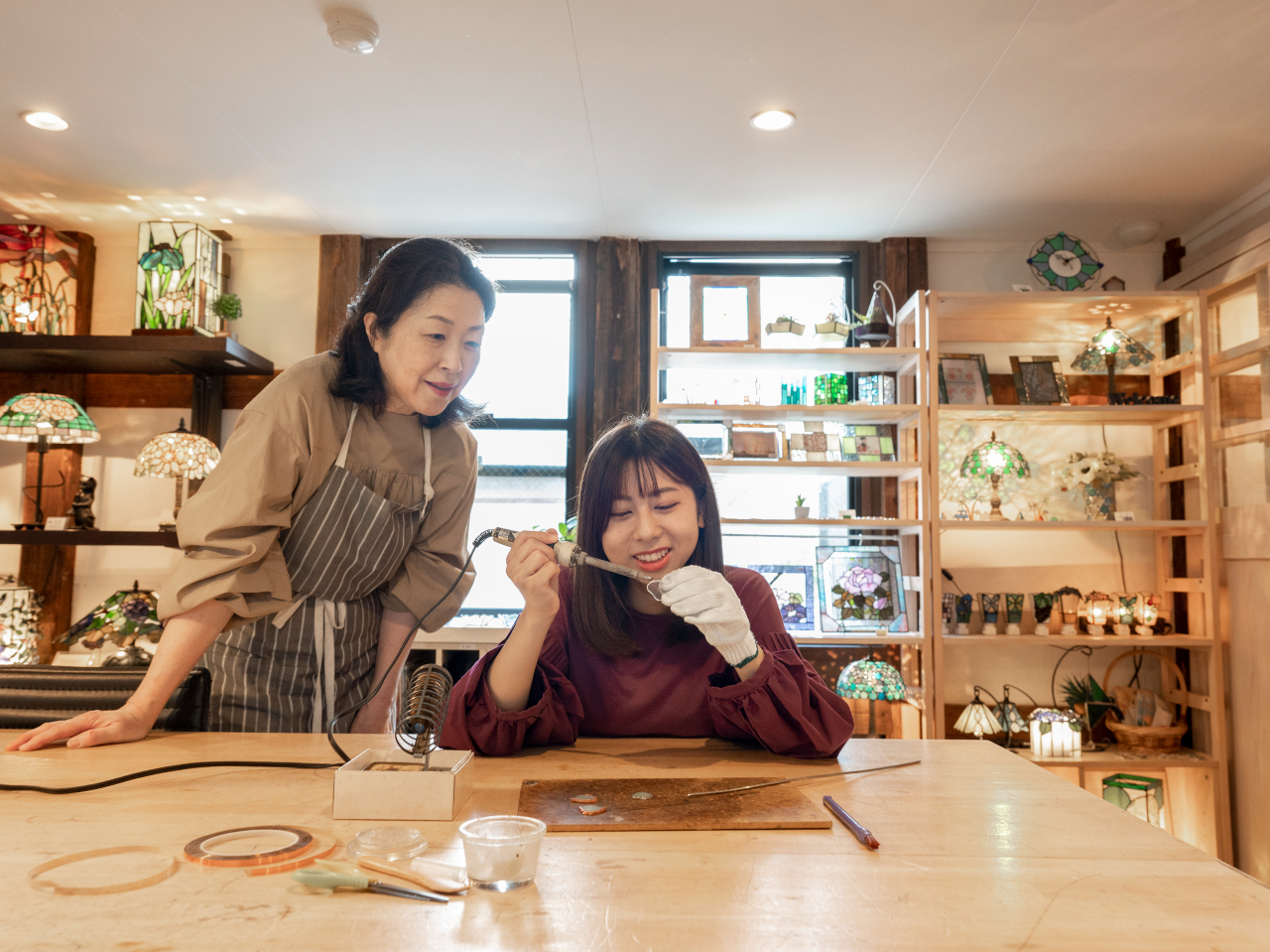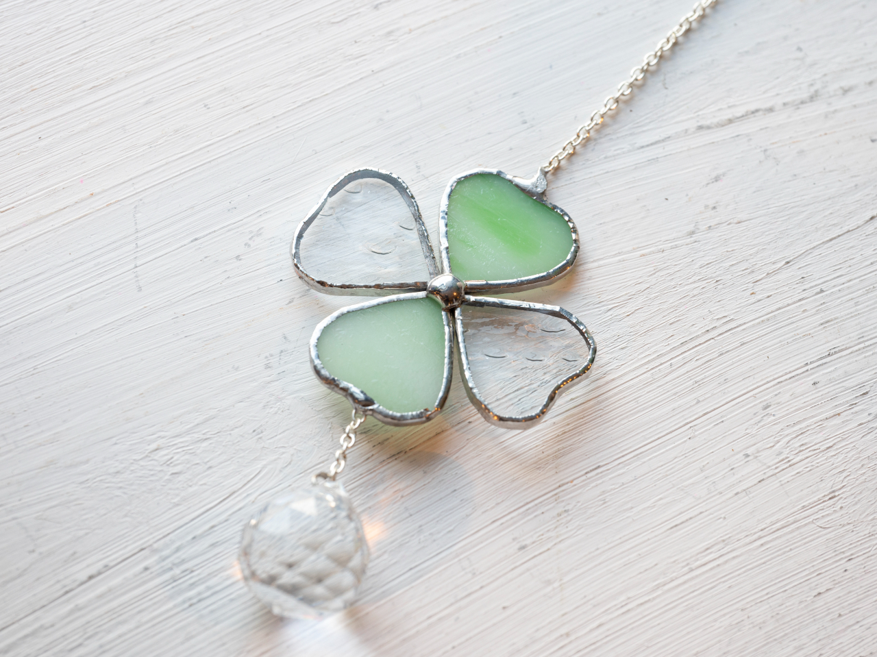 佐賀市歴史民俗館・旧久富家で昭和ロマンにひたりながら、本格ステンドグラスの技法で制作体験ができます。幸せを呼ぶと言われている四つ葉のクローバー・サンキャッチャー。