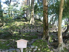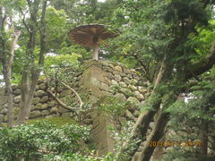 霞ヶ池の畔にあるわりと大きな築山で、頂上に向けて螺旋状の石段を登るようになっています。池の向うに唐崎松が見えます。頂上には雨傘のような形をした避雨亭あります。