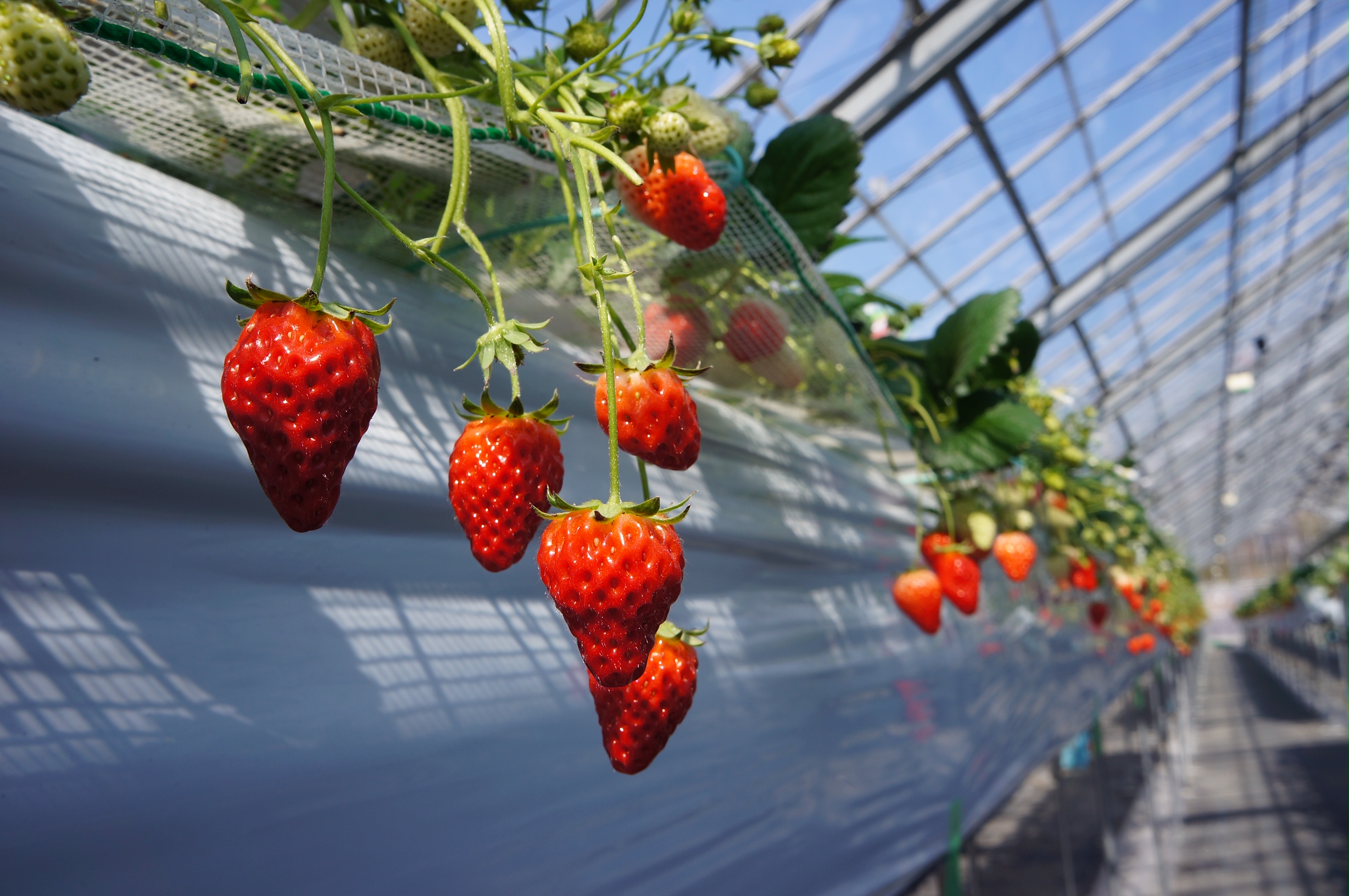 ◎高設栽培、通路も広いの立ったまま、ゆったり摘めます♪いちご狩り