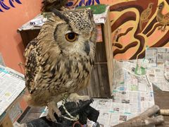ふくろうと写真撮影、エサやり、腕に乗せたり、鷹匠気分を体感したり