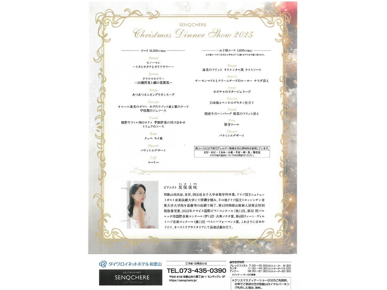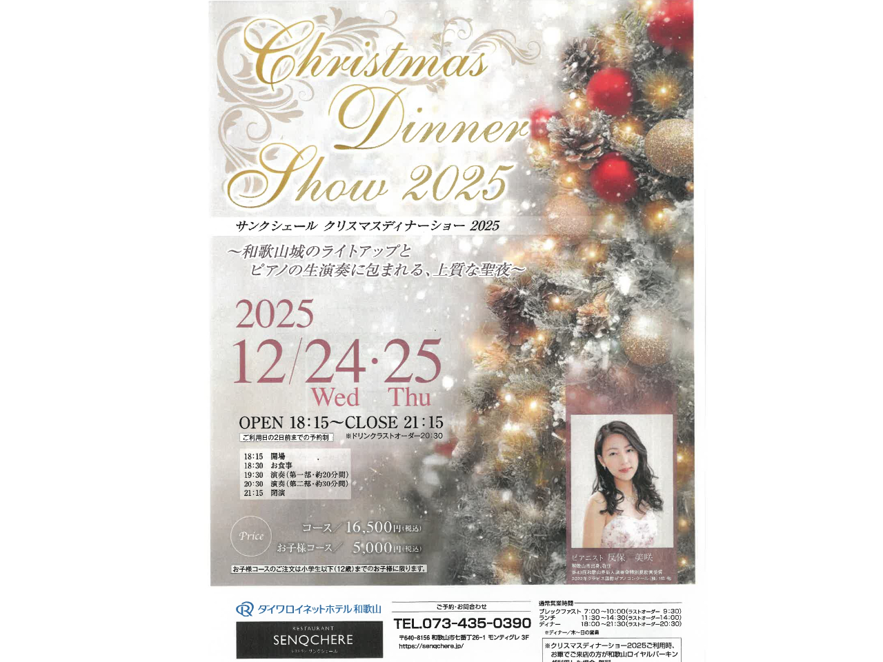 和歌山市出身のピアニスト・反保美咲さんを迎え、12月24日・25日の2日間限定で「サンクシェールクリスマスディナーショー2025」を開催します。和歌山城を望む当店の上質な空間で特別なディナーをどうぞ。