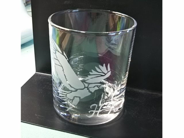 イルカの模様をサンドブラストしたクリアタンブラーに下からLEDライトを照らすと幻想的になります