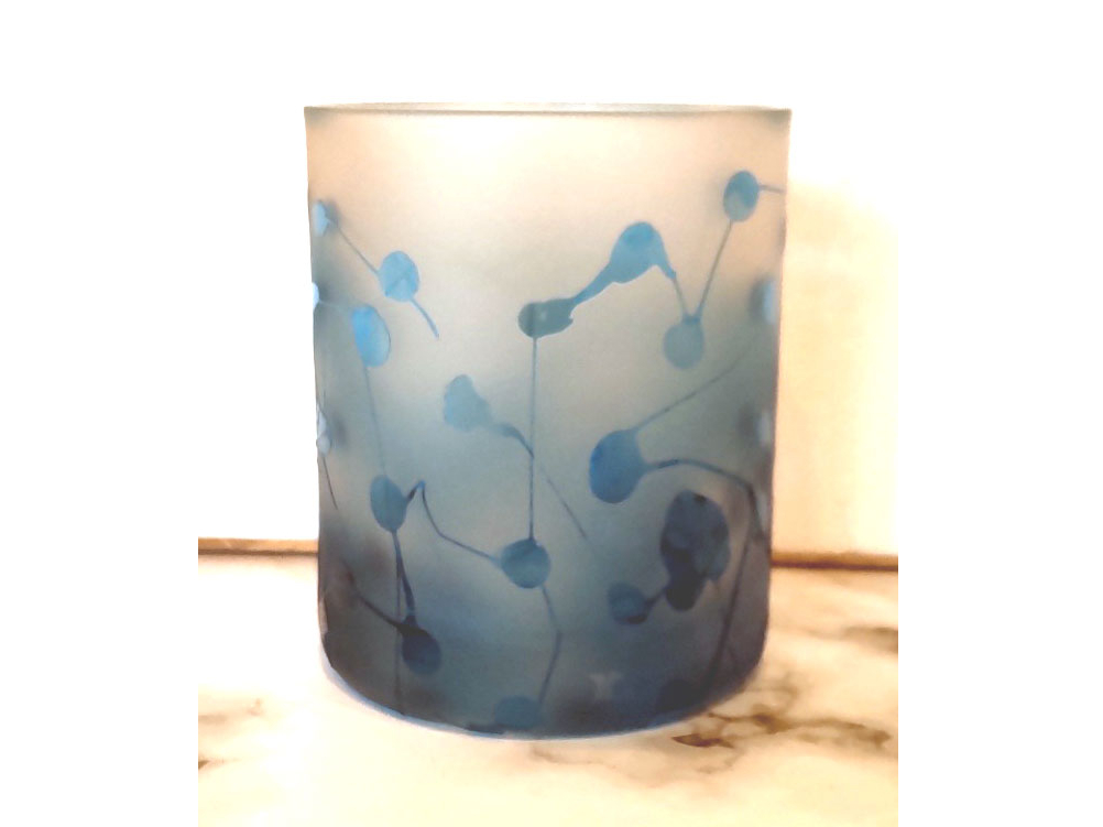 色付きグラスに砂を吹き付け、表面をすりガラス状にしデザインする技法です。